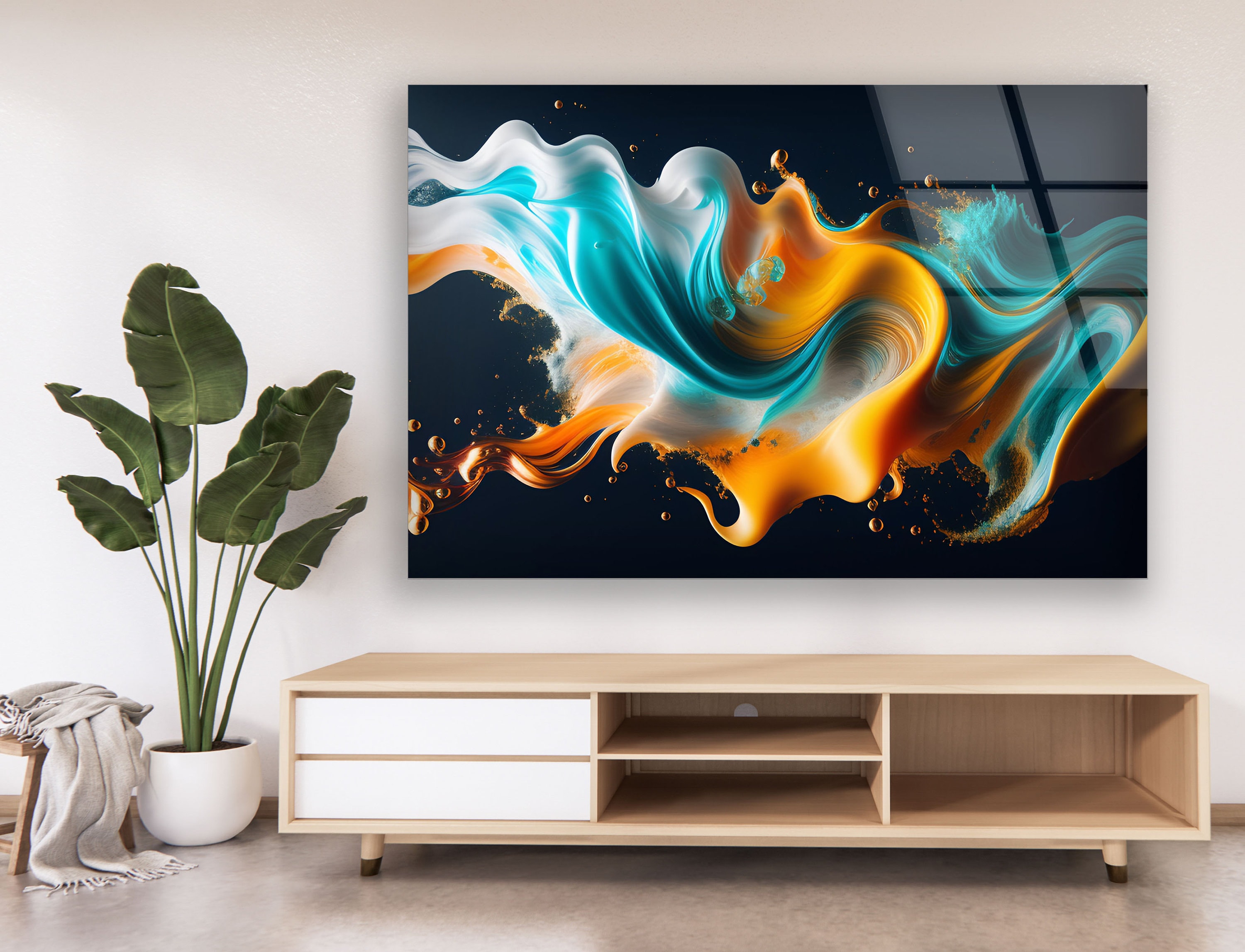 Add movement and color to your home with this abstract tempered glass wall art, featuring a vibrant mix of blue, white, and orange metallic waves.