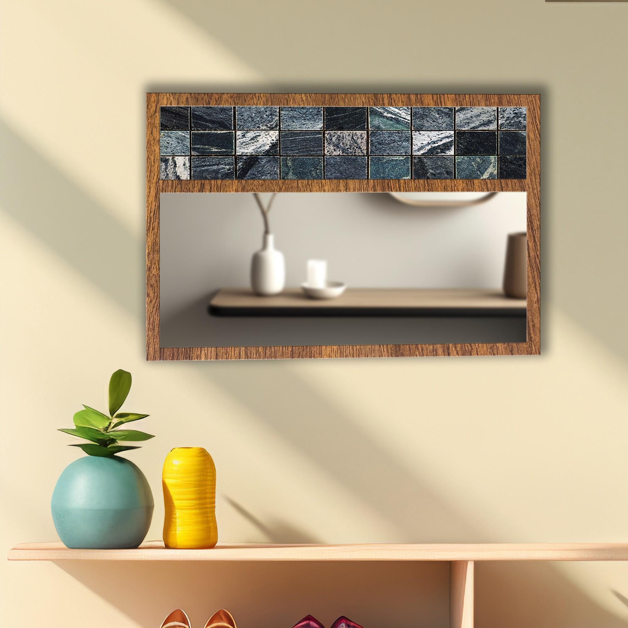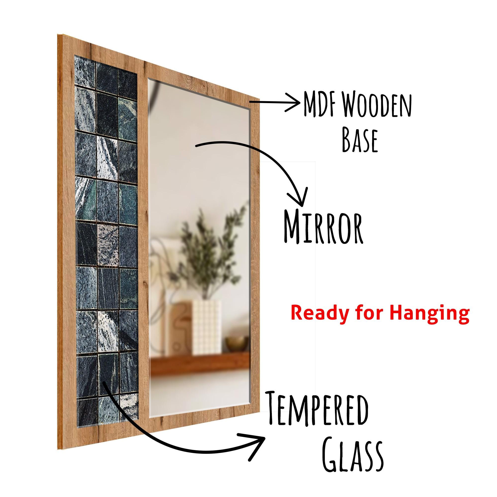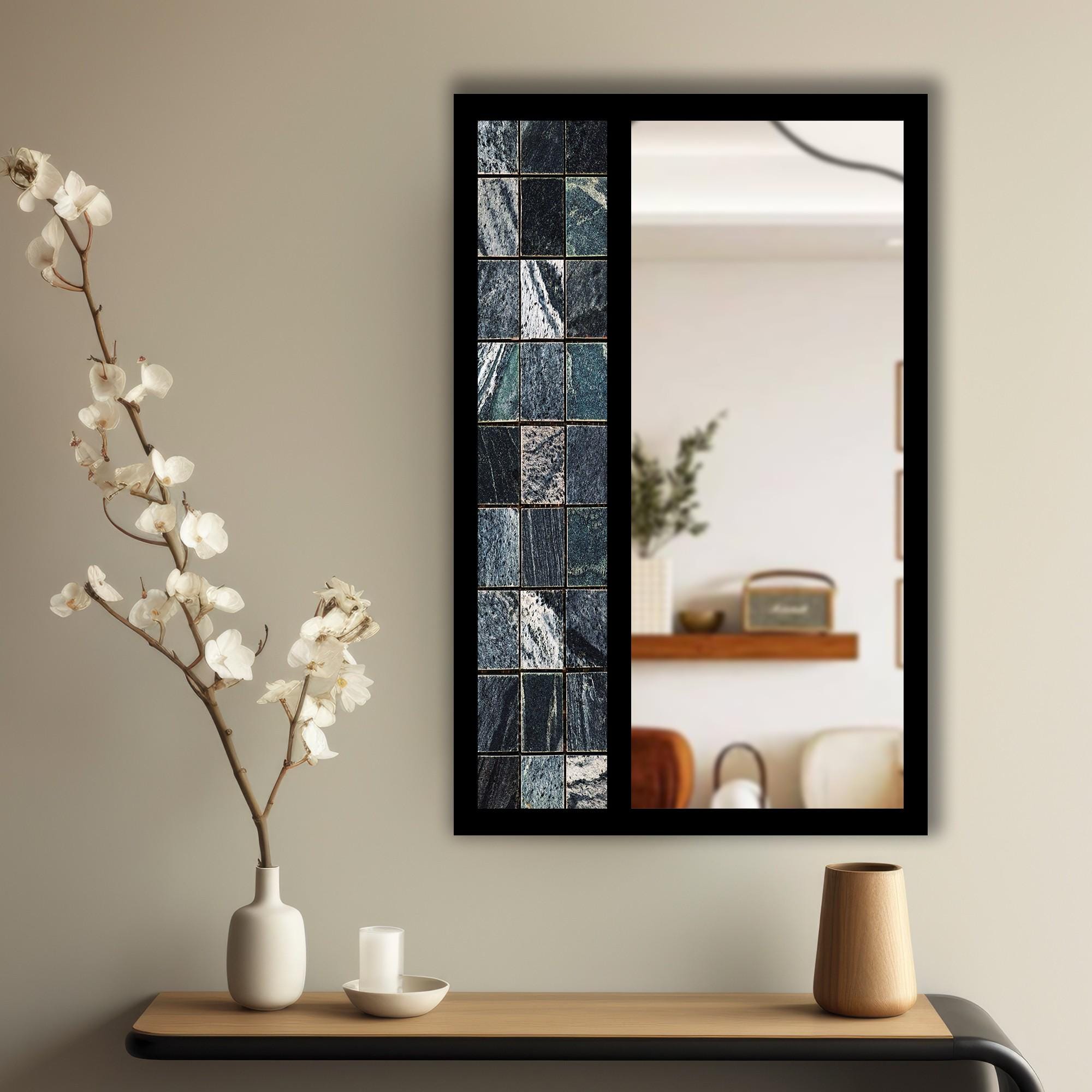 Black Marble Tile Tempered Glass Wall Mirror | Decorative MDF Frame | Modern Bathroom & Entryway Wall Decor | Ready to Hang