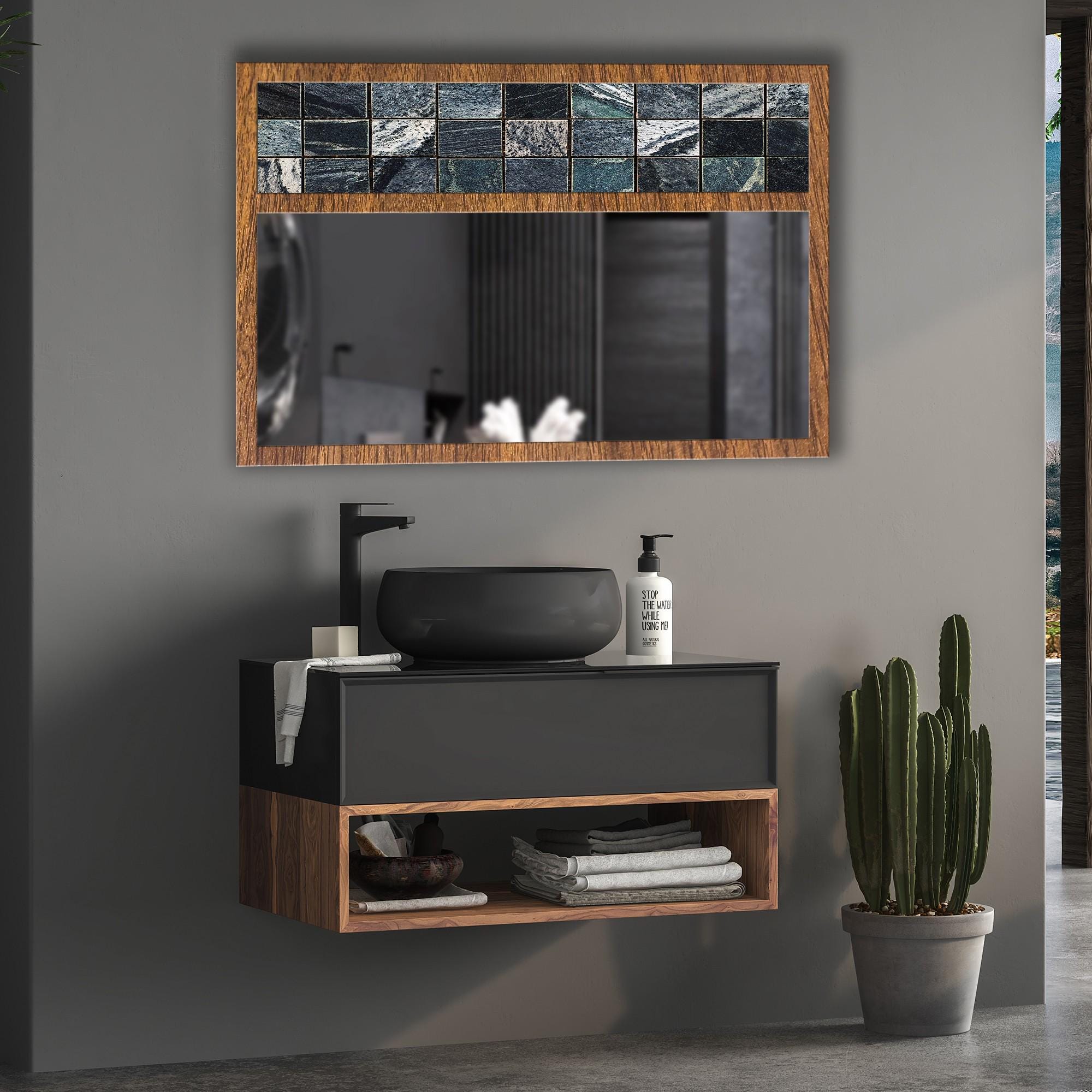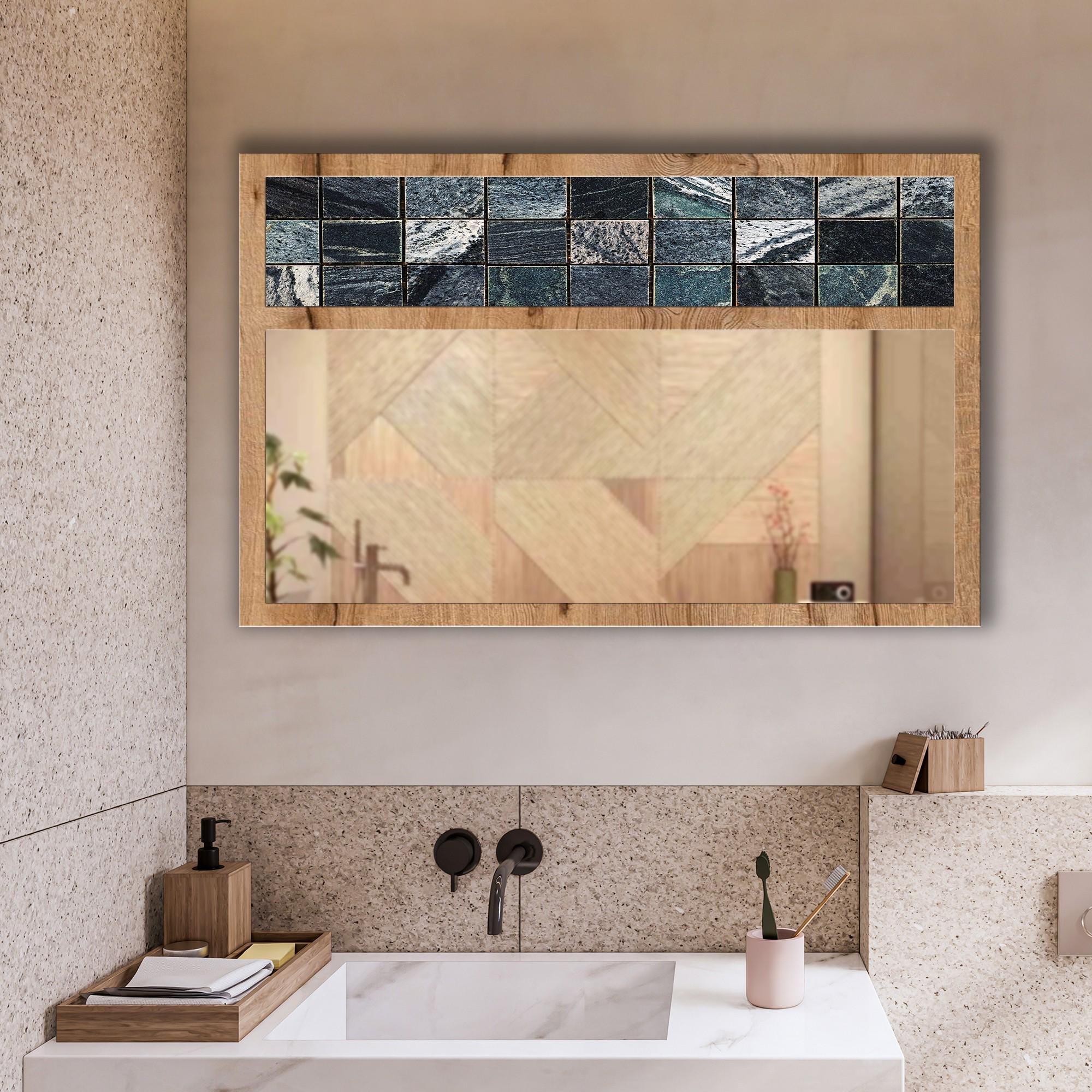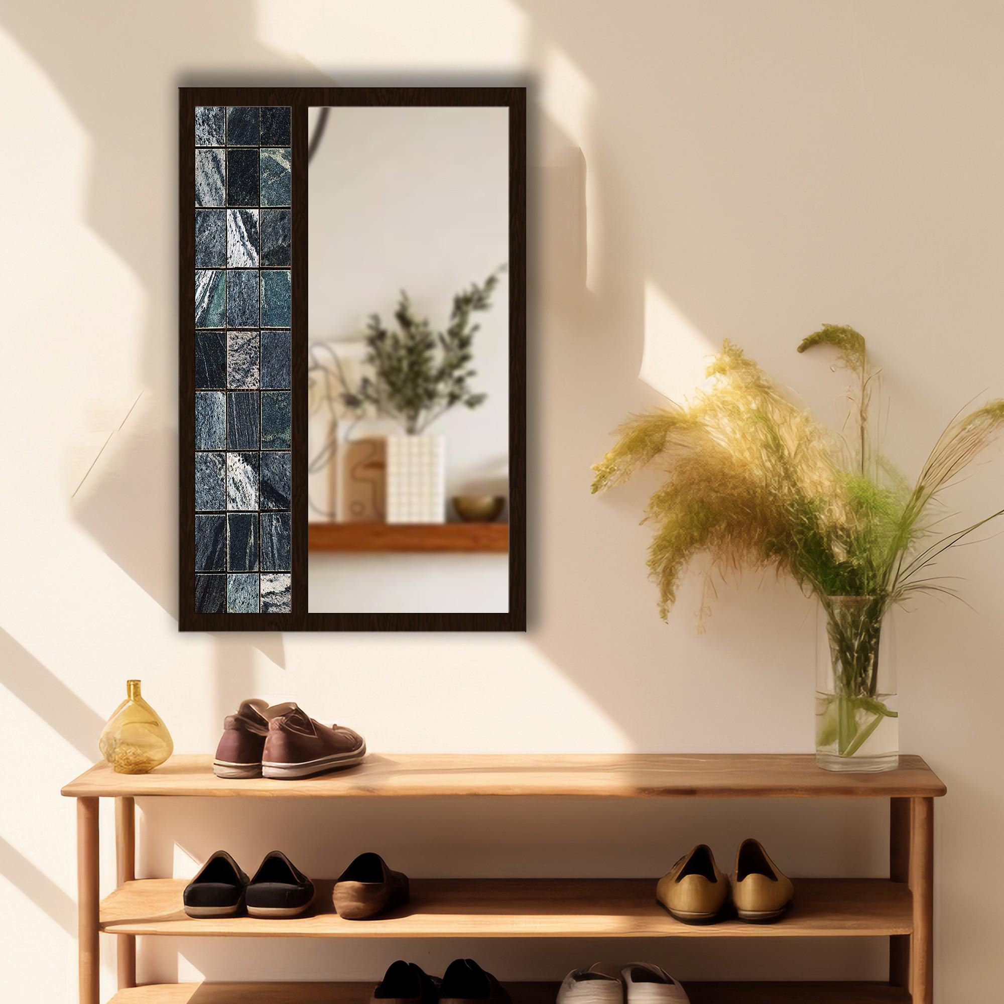 Black Marble Tile Tempered Glass Wall Mirror | Decorative MDF Frame | Modern Bathroom & Entryway Wall Decor | Ready to Hang