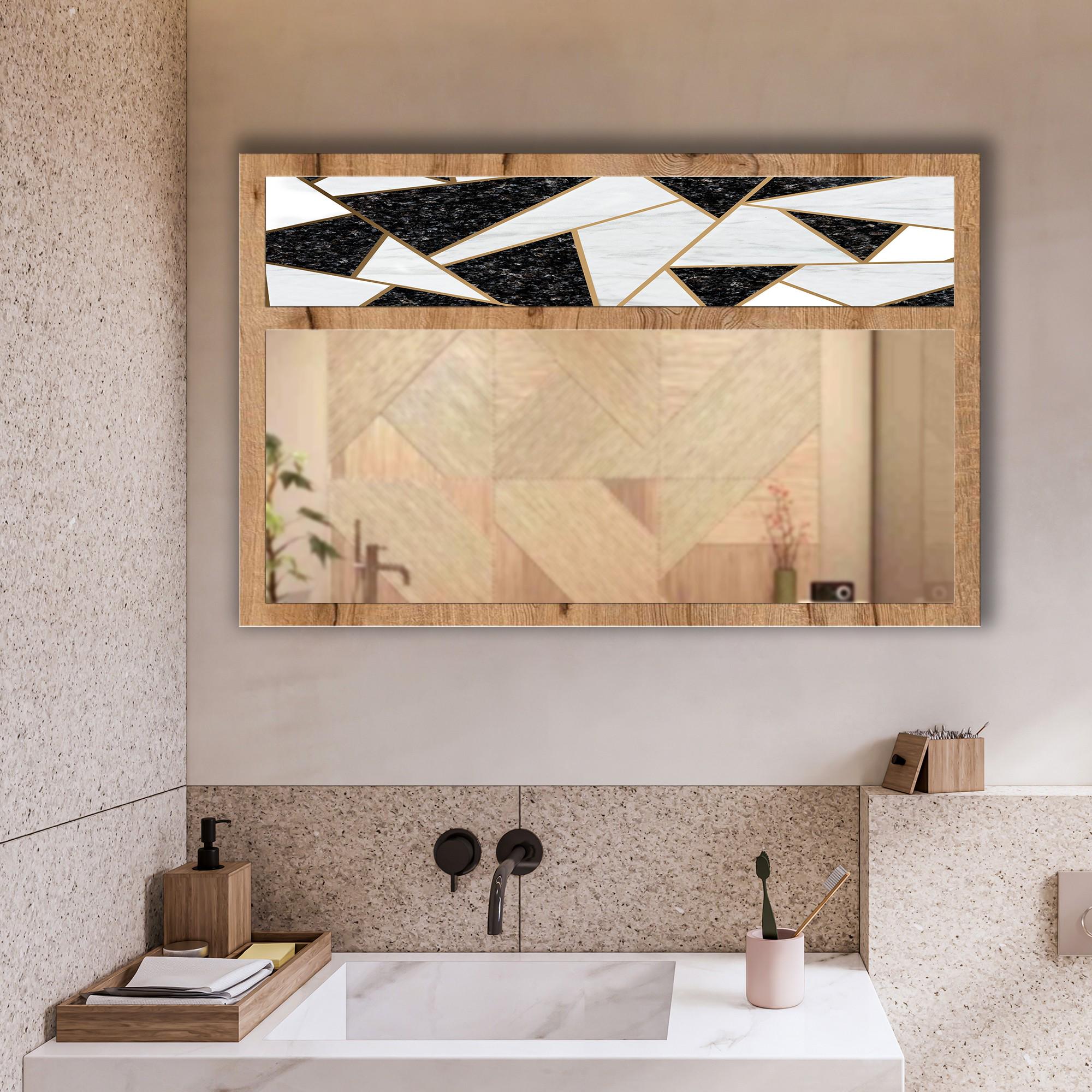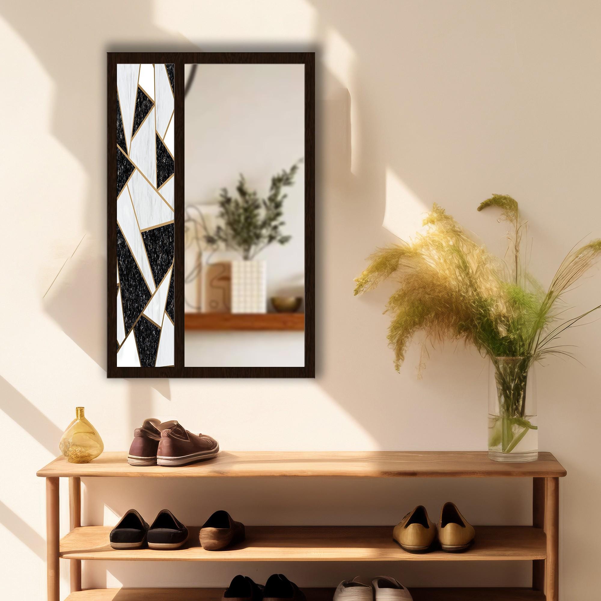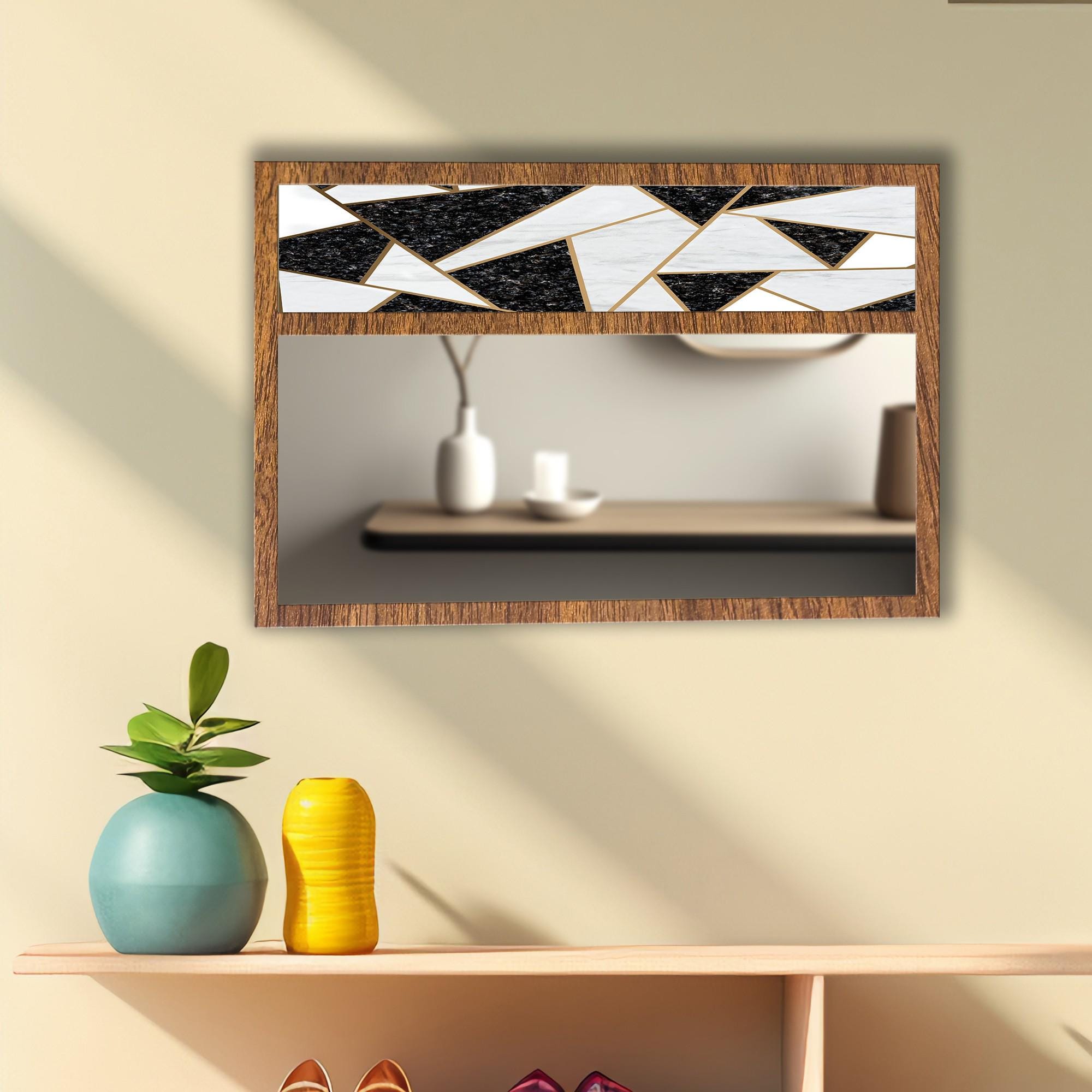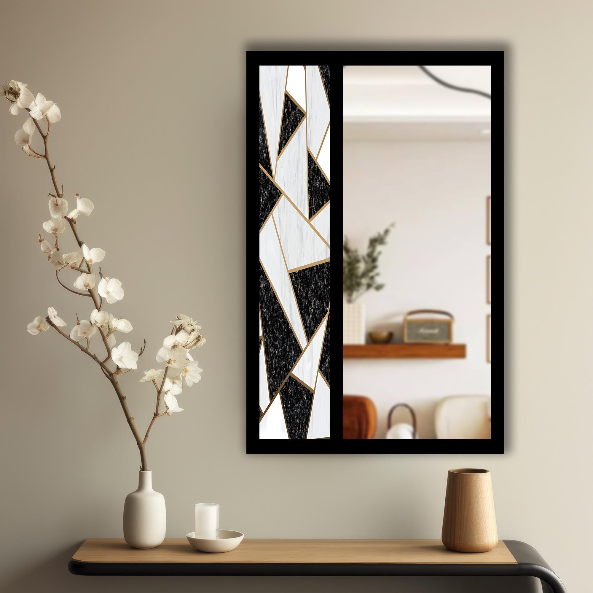 Black White Geometric Tempered Glass Wall Mirror | Modern Abstract Mosaic Design | Decorative MDF Frame | Entryway & Bathroom Wall Decor
